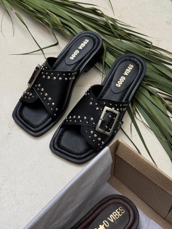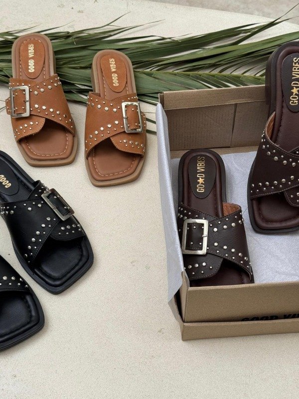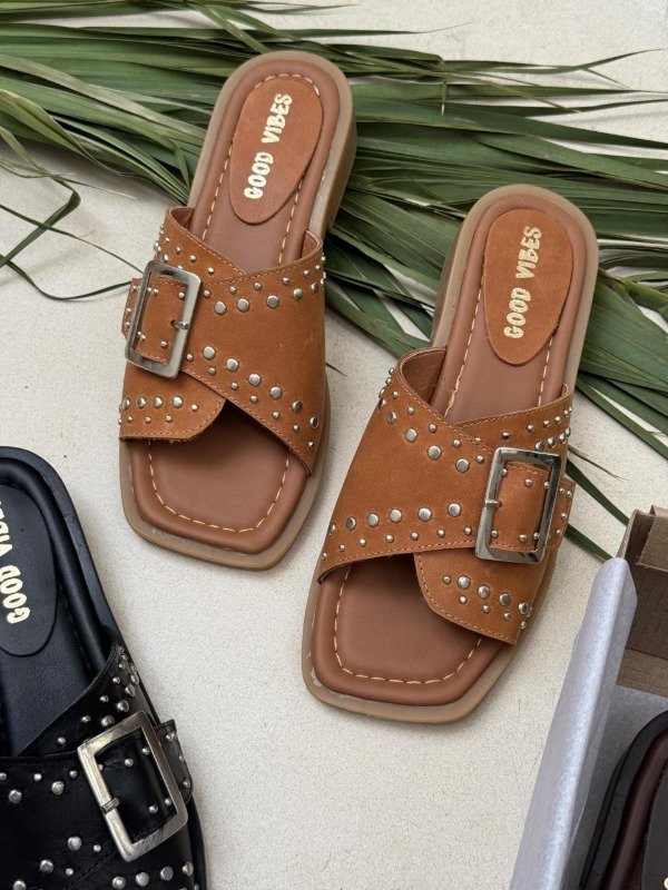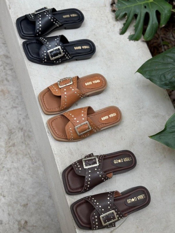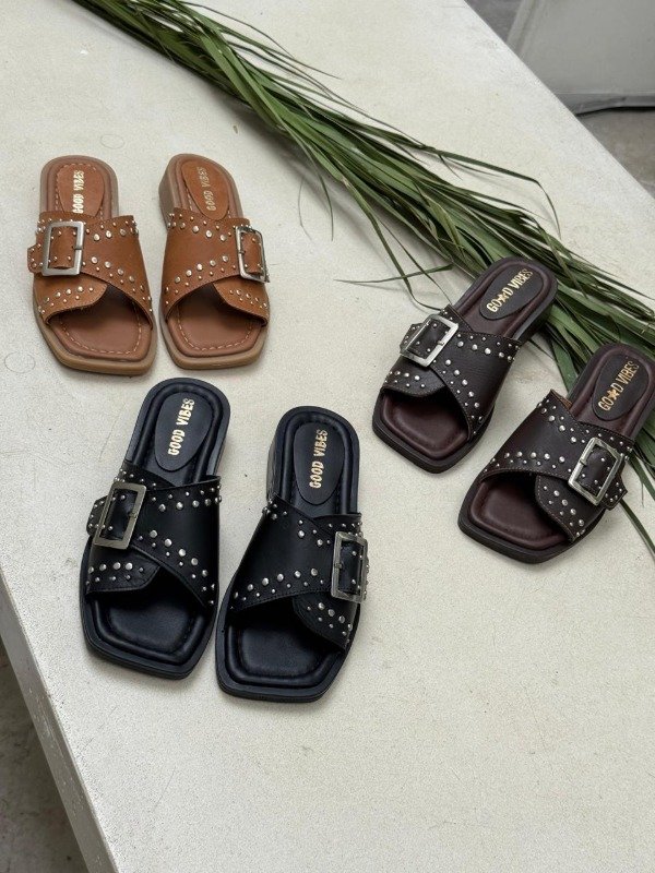 Las chatitas marcan tendencia, y las sandalias ARIA se destacan por las tachas y la hebilla grande que le dan el toque de la temporada de verano, la base es TR osea super liviana y ni te patinas!