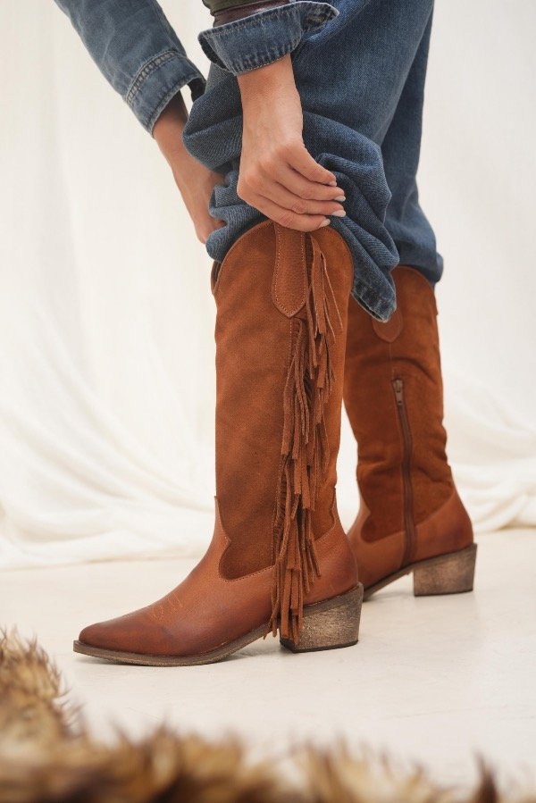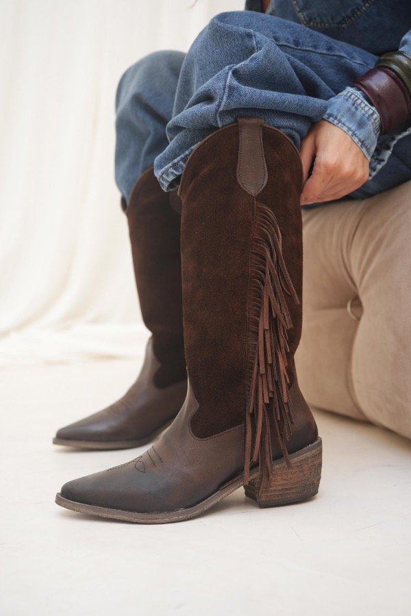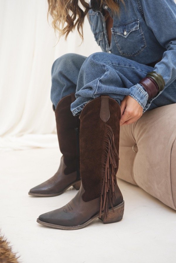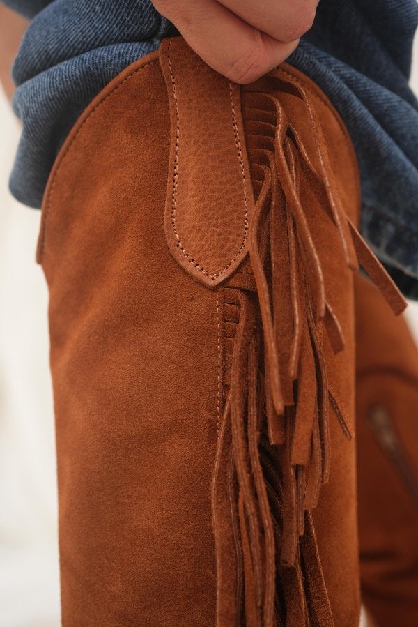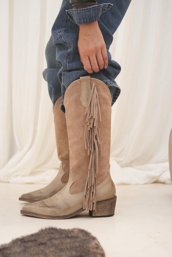 Confeccionadas en 100% cuero, combinan cuero floter + gamuzón, logrando un juego de texturas que eleva cualquier outfit al instante ✨ Su diseño de caña alta con flecos laterales le da ese movimiento único que marca la diferencia en cada paso 😍