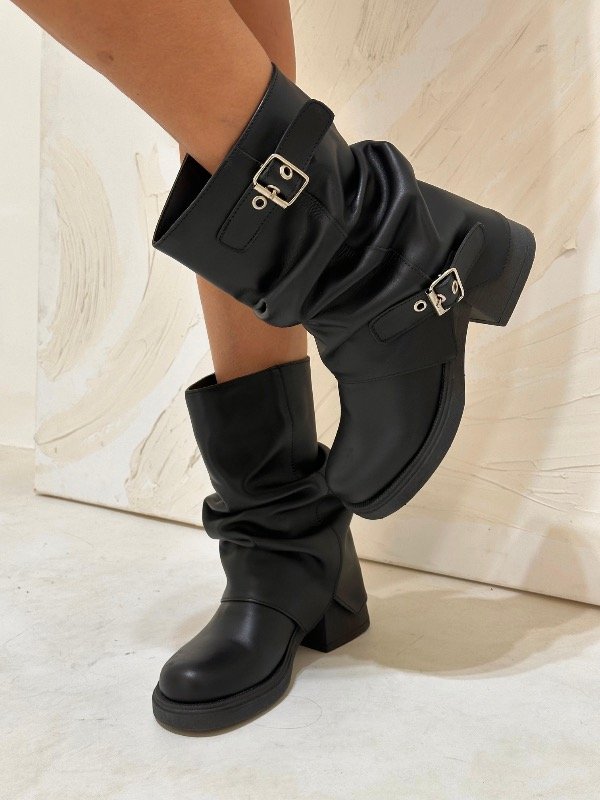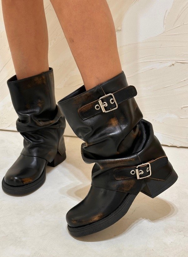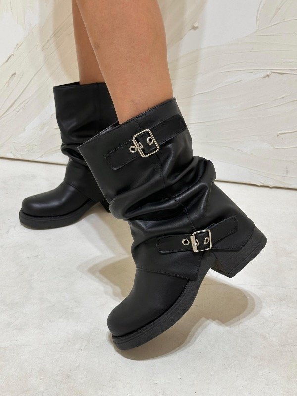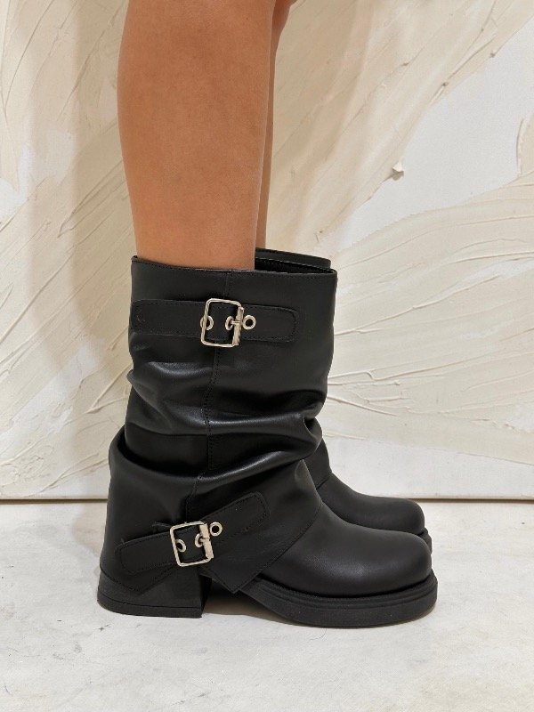 Hay botas… y después están estas. Un modelo que combina diseño, carácter y tendencia en una sola pieza. Confeccionadas en cuero genuino, con caña levemente fruncida y detalle de hebillas metálicas, son el equilibrio perfecto entre rebeldía y sofisticación.