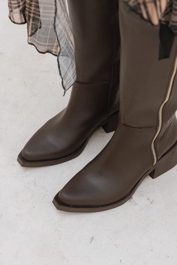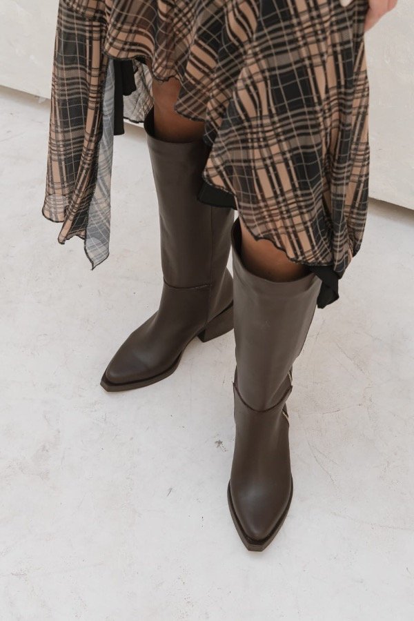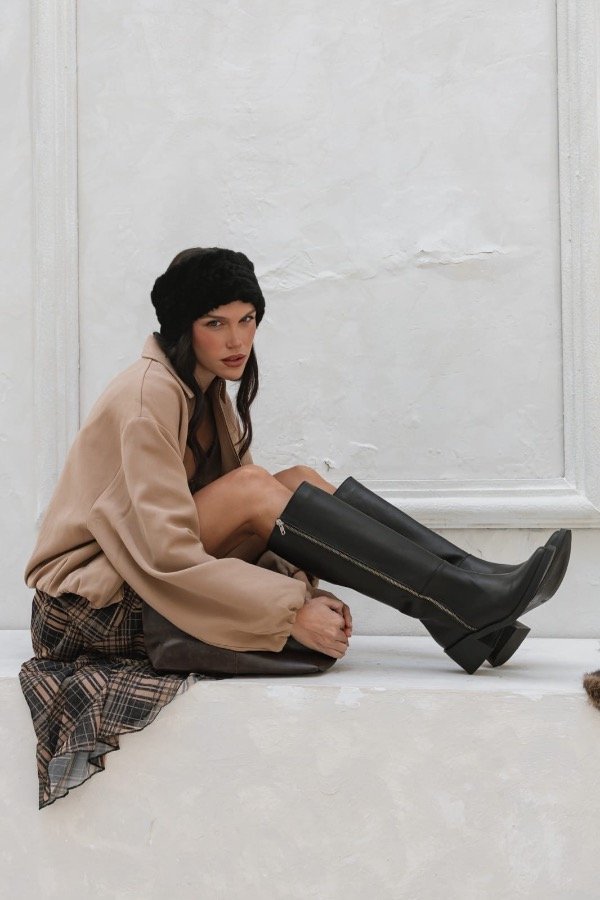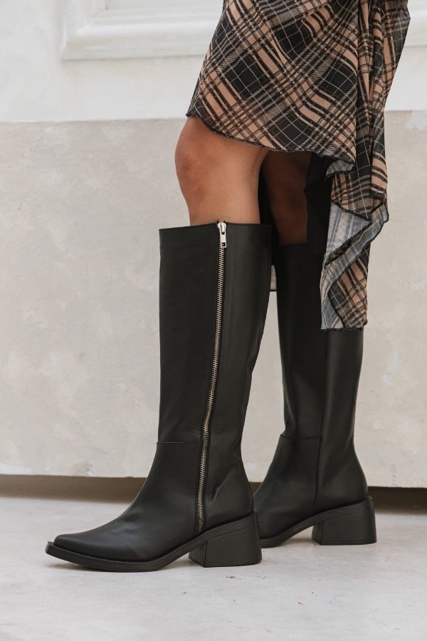 Confeccionadas en cuero, su caña alta y diseño limpio logran una silueta estilizada que alarga visualmente la pierna. El detalle del cierre suma practicidad y un toque moderno que marca la diferencia.